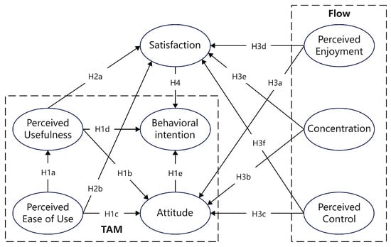 To enter a flow state, users must focus on a specific, limited area. If they attempt to multitask, their focus will be disrupted, preventing them from achieving a flow experience [26,30]. The higher the skill level, the greater the sense of control, leading to a heightened psychological state. On the other hand, if the user’s skill level is low, the user will feel inadequate and frustrated, leading to a low flow level. Visitors who feel immersed by the technology are more likely to be in a flow state. Perceived enjoyment, concentration, and perceived control will positively impact their attitude. Based on the related studies discussed above, this study proposes the following hypotheses: