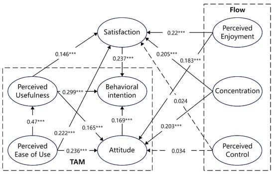 As shown in Table 4, after analyzing the relationships among perceived usefulness, perceived ease of use, perceived enjoyment, concentration, perceived control, attitude, satisfaction, and BI, the following results were obtained.