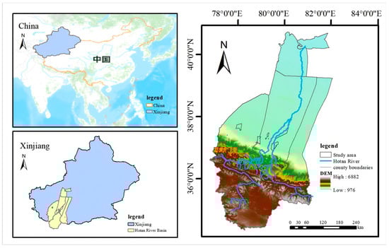 The Hotan River originates in the Karakoram Mountains and the northern foothills of the Kunlun Mountains. These two major headwaters represent the Kara Kashi River and the Yulong Kashi River, which converge in Moyu County, located in southwestern Xinjiang. The geographic location of this coverage ranges across 34°83′~40°48′ N, 77°53′~81°66′ E (Figure 1). The river crosses the Taklamakan Desert to the northeast, flows through Moyu County and Lopu County in the Hotan Region and Awati County in the Aksu Region, and finally joins the Tarim River near Kara Asti in Alar City. The river’s total length is 300 km in its mainstream, its watershed area is approximately 4.887 × 104 km2, and its multi-year average annual runoff flow is 2.26 billion m3. The basin has a warm-temperate extreme arid desert climate, dominated by ice and snow melt water recharge and supplemented by rainfall recharge. Inter-annual variations in runoff are minimal, and the distribution of runoff is uneven throughout the year, with summer runoff accounting for about 70% to 80% of the annual runoff.