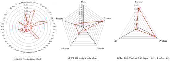 In terms of Ecology–Produce–Life Space, as shown in Figure 2c, the ecological space has the largest weight of 40.44%, representing the main spatial layer of influence on water ecological security. The life space has the smallest weight of 19.77%, functioning as the secondary spatial layer of influence on water ecological security. In addition, the produce space weighs 39.80%.