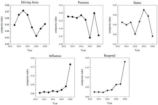 The DPSIR system model was used to analyze the water ecological safety evaluation of the Hotan watershed, and the trend of each criterion layer is presented in Figure 3. This study indicates that in this system, the pressure layer has the largest composite index and the greatest influence on water ecological security, which is the main driver of the DPSIR system. In contrast, the status layer has the smallest composite index and the smallest influence on water ecological security. The drive and status indices have been on a steady holding trend, mainly because the population density and the number of people in towns and cities have remained more or less constant. The influence and response indices demonstrate a pattern of stabilization followed by growth, especially a rapid increase during 2019–2020. This is mainly due to the yearly increase in the area of grassland and forested land, as well as a significant increase in agricultural, forestry, and water expenditures and investment in water and environmental inputs from year to year. The pressure index demonstrates a pattern of stabilization followed by large fluctuations. This is primarily due to the total water consumption, the supply of surface water sources, and the annual discharge of industrial wastewater decreasing year by year in 2013–2017. Conversely, the supply of groundwater sources and the discharge of sewage wastewater increased year by year in 2013–2017. The supply of groundwater sources increased sharply in 2018, and the annual discharge of industrial wastewater and sewage wastewater increased sharply in 2019. In 2020, annual industrial wastewater discharge and sewage wastewater discharge again increased to the highest-ever recorded levels. Therefore, in the subsequent protection of water ecological security, it is necessary to control the total amount of water consumption, rationally allocate the amount of water withdrawn from groundwater sources and surface water sources, focus on the discharge of industrial and sewage wastewater, reduce the amount of wastewater discharged, conserve water, and improve the efficiency of wastewater treatment and recycling.