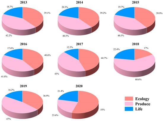 Within Ecology–Produce–Life Space, ecology, life, and produce synergize with each other, which represents the natural environment, human beings, and the economic and social society of human beings and nature, respectively. As shown in Figure 5, the proportion of Ecology–Produce–Life Space has changed over the years. Ecological space continues to expand annually except in 2018, eventually becoming the most prominent spatial layer in 2020. Therefore, it is necessary to continue to pay attention to the importance of the ecological environment, especially by investing in grassland and forested areas to reduce soil erosion and desertification. Currently, it is necessary to control the total amount of water consumed, rationally allocate the amount of water withdrawn from both groundwater and surface water sources, minimize the exploitation of groundwater, emphasize the discharge of sewage and industrial wastewater, and improve the efficiency of water recycling.