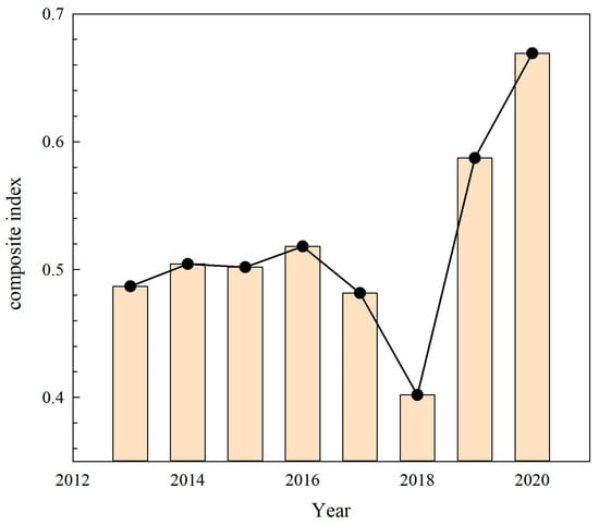According to Figure 6, the comprehensive index of water ecological security in the Hotan River Basin exhibited a fluctuating upward trend from 2013 to 2020. From 2013 to 2016, the water ecological safety condition was average, with some indicators deviating from the ideal status, ecological problems emerging, and the system function degrading, requiring attention. From 2016 to 2018, the composite index declined to a critical status, indicating the existence of multiple abnormal indicators and water quality problems, requiring protection and restoration measures. From 2018 to 2020, the composite index increased year by year, and the water ecological safety condition changed from fair to good, showing overall improvement and that the system is capable of self-repair.