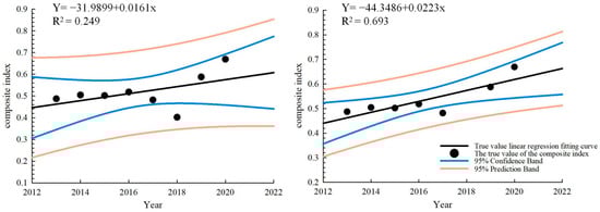 Water resources in the Hotan Basin have a significant influence on the neighboring ecosystems, the economy, and society. It is crucial to predict the trend of the comprehensive index of water ecological security in the Hotan River Basin, which will help to facilitate the implementation of relevant protection measures promptly. As shown in Table 3 and Figure 7, this study employed regression analysis to predict the future trend. Through the least squares method, the fitted curve for 2012–2020 was obtained: Y = 0.0161X − 31.9899. Due to the substantial increase in the main influencing factor of water ecological security during 2018, the groundwater source supply (EP2), there was a notable decrease in the composite index of water ecological security. After deletion and optimization, we obtained the fitted curve to remove the year 2018, which has a high degree of fit, significant, and does not have the problem of multiple covariance. The fitting formula is as follows: Y = 0.0223X − 44.3486. The predictive simulation results show that the comprehensive index of water ecological security may continue to grow in the coming years and remain in a positive status. This indicates that the local community will continue to prioritize the protection and construction of the ecological environment, that the water ecosystem will remain in a healthy status, with normal ecological processes, and that the basic structure of the ecosystem is functional and capable of self-repair.