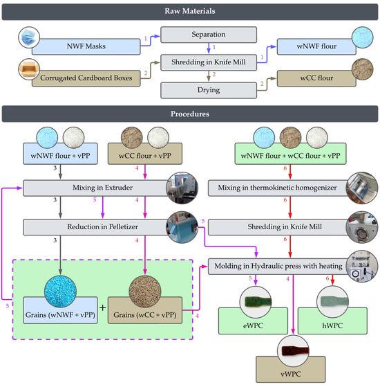 Flowchart of the production of wood–plastic composites (WPCs) with nonwoven fabric waste (wNWF), corrugated cardboard waste (wCC), and virgin polypropylene (vPP).