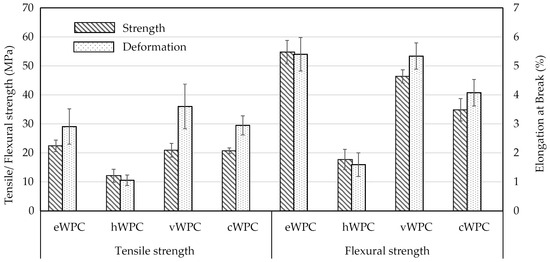 Figure 2 presents the mean values for the maximum stress and elongation at break during the tensile and flexural strength tests. The composites eWPC, vWPC, and cWPC demonstrated similar elongation at break under tensile stress, approximately 3%, whereas the hWPC showed the lowest elongation, around 1%. Similarly, on the flexural strength test, the eWPC, vWPC, and cWPC exhibited similar elongation values of approximately 4–5%, while hWPC once again displayed the lowest elongation, about 1.5%.