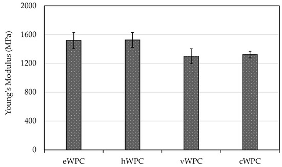 Figure 3 illustrates the Young’s Modulus (modulus of elasticity) of the various WPC samples, including the blend and commercial composite. eWPC and hWPC displayed the highest Young’s Modulus, with values approaching 1600 MPa. In contrast, the vWPC exhibited an intermediate Young’s Modulus, around 1300 MPa, suggesting lower stiffness than the other WPC types.