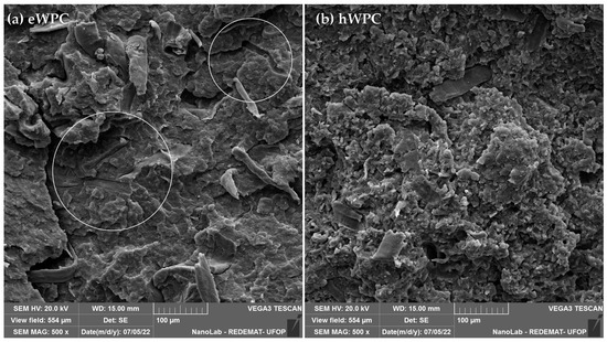 Figure 4 presents the SEM images of the fracture surface following tensile tests of the eWPC (a) and hWPC (b) samples.