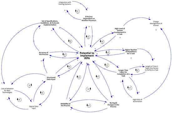 This research intended to develop a process analysis framework for IRPA adaptation given that there is a lack of research on process analysis frameworks for IRPA. This research used a System Dynamics-based CLD diagram to develop the framework. Causal-Loop Diagrams (CLDs) are powerful tools for illustrating the feedback structure inherent in a system that enables one to construct conceptual models that effectively showcase the dynamic aspects of a given problem or situation [53,54]. In a CLD, variables are interconnected, and the arrows symbolize the causal relationships between them [55,56].