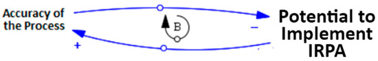 - Accuracy—When an already existing process has a higher level of accuracy, that specifically does not need to adopt IRPA. Therefore, that relationship has a negative impact. On the other hand, when there is a high potential to adopt IRPA, that helps to increase the accuracy of the processes. Therefore, that relationship has a positive impact, as represented in Figure 3.