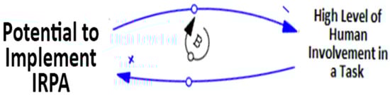 - Level of human involvement—When automating a process with a high level of human involvement, it requires to have decision-making capabilities, adopt to changing conditions, and it should reduce human errors; then, there is a higher potential to implement IRPA. Therefore, that relationship has a positive impact. On the other hand, implementing IRPA reduces human involvement in a process, since that relationship has a negative impact, as represented in Figure 4.