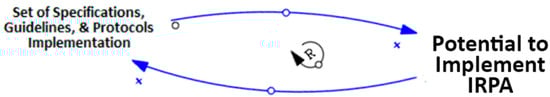 - Standardization—Standardization means the implementation of a set of specifications, guidelines, and protocols. If a process already has standardization, that increases the potential to implement IRPA and vice versa, so that both relationships have a positive impact, as represented in Figure 5.