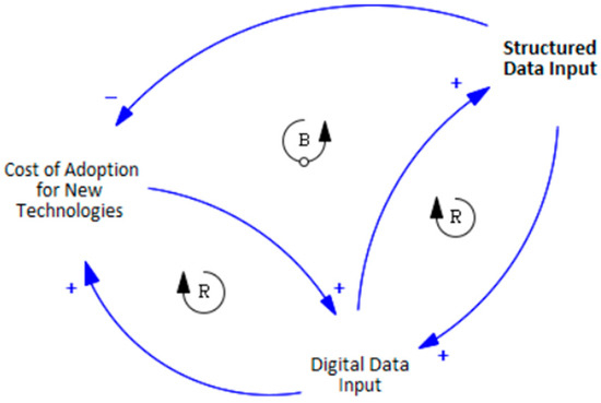 There was a valuable balancing loop that has been identified in the CLD shown in Figure 7. The factors structured data input, digital data input, and cost of adoption for new technologies are contributing to this loop. Utilizing digital data and structured data in processes can provide significant benefits and serve as a wise investment. When a process involves digital data input, the information received is typically well-structured. This structured nature of input data offers advantages in terms of implementing new technologies, as it eliminates the need for extensive data cleansing or restructuring efforts. By leveraging existing structured data, organizations can avoid additional costs associated with data preparation and streamline the implementation process.