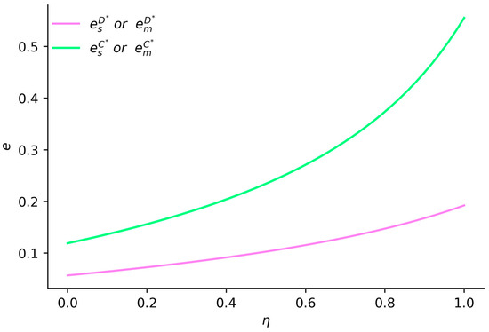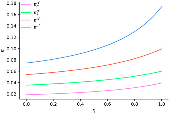 Figure 2 illustrates that when , both the emission reduction levels of suppliers and manufacturers under decentralized decision-making, as well as the supply chain profit under centralized decision-making, increase with a higher vertical spillover rate. The emission reduction levels of suppliers and manufacturers under centralized decision-making are higher compared to those under decentralized decision-making, and the disparity between them grows with an increase in the vertical spillover rate. This indicates that centralized decision-making is more effective than decentralized decision-making in enhancing the enthusiasm of both manufacturers and suppliers for emission reduction.
