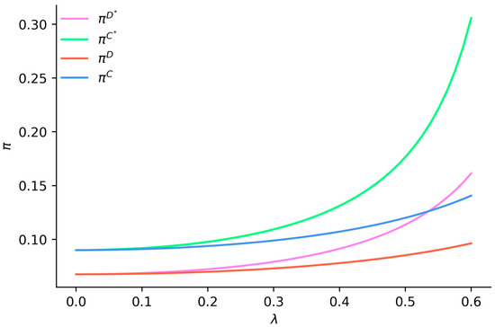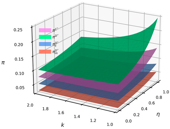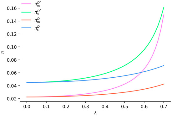 Figure 4 indicates that when , the profits of both suppliers and manufacturers increase with the rise in the consumer low-carbon preference coefficient. Under emission reduction vertical spillovers, the profits of suppliers and manufacturers are higher compared to scenarios without such spillovers, and the disparity between them widens as the low-carbon preference coefficient increases. Specifically, under emission reduction vertical spillovers, supplier profits exceed manufacturer profits, and this gap narrows as the low-carbon preference coefficient increases. In contrast, without emission reduction vertical spillovers, supplier profits are higher than manufacturer profits, and this profit gap widens with an increase in the low-carbon preference coefficient. This suggests that emission reduction vertical spillovers can enhance the profits of both suppliers and manufacturers, and the potential for profit improvement increases as consumer low-carbon preferences rise.