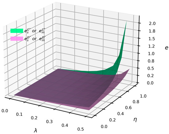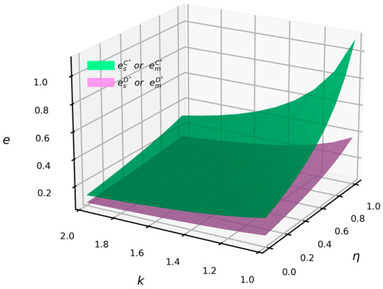 Figure 6 shows that when and , the emission reduction levels of suppliers and manufacturers under centralized decision-making are consistently higher than those under decentralized decision-making. Moreover, as consumer low-carbon preferences and vertical spillover rates increase, the disparity in emission reduction levels between centralized and decentralized decision-making widens. Both an increase in vertical spillover rates and higher consumer low-carbon preferences positively impact the emission reduction levels of suppliers and manufacturers, with more pronounced effects observed under high levels of low-carbon preferences and vertical spillovers.