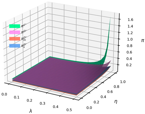 Figure 3 indicates that when , the profits of suppliers, manufacturers, and the supply chain, as well as the supply chain profit under centralized decision-making, all increase with a higher vertical spillover rate. Due to the first-mover advantage in decision-making, the supplier’s profit under decentralized decision-making is higher than that of the manufacturer, and this disparity grows with an increasing vertical spillover rate. The supply chain profit under centralized decision-making exceeds that under decentralized decision-making, and this advantage can be further enhanced by increasing the exchange and sharing of emission reduction R&D technologies.