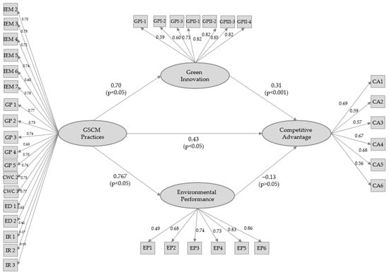 As seen in Table 6, the results of the research variables determined as GSCM practices, GI, EP, and CA are included in terms of χ2/df, GFI, AGFI, NFI, CFI, and RMSEA values, as well as good fit values and acceptable fit values. The table was first examined in terms of χ2/df value. The value χ2/df is used to test the fit between the established model and the data. While the value of χ2/df, which is below 3, is considered to be an indicator of a good fit, the value, which is up to 5, is considered an acceptable fit [91,92,93]. In this respect, when Table 6 is examined, it is seen that χ2/df value for CFA for each scale is within the limits of a good fit. Good fit is indicated when the goodness of fit (GFI) index is between 0.95 and 1.00. A value between 0.90 and 0.95 is an indicator of an acceptable fit [94,95]. In this context, it is seen that the GFI value calculated for CFA for each scale is within the limits of an acceptable fit. Adjustment, in terms of the goodness of fit index (AGFI), values between 0.90 and 1 are indicative of a good fit [96]. In this regard, it can be stated that the values obtained for CFA for each scale are within the acceptable limits. In terms of normative fit index (NFI), the range 0.95–1 is an indicator of a good fit [97]. However, there are also studies that consider this value to be above 0.80 as sufficient [98,99]. In this context, it is seen that the value calculated for CFA for each scale is within the acceptable fit range. A comparative fit index (CFI) value between 0.95 and 1 is an indicator of a good fit, and values above 0.90 are considered acceptable [100]. Therefore, it can be stated that the value obtained for CFA for each scale is within the good fit range. Root mean square error of approximation (RMSEA) values less than 0.05 can indicate a good fit [101]. In this regard, it is seen that the value calculated for CFA for each scale is within the acceptable limits.