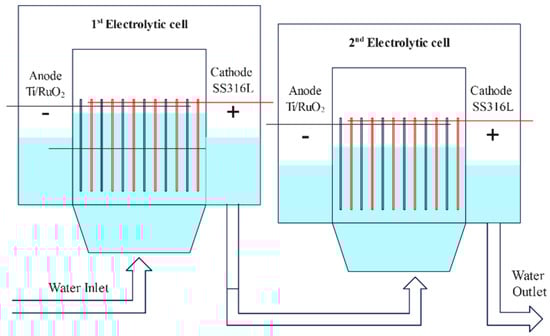 Industrial tests demonstrated that EO technology was effective for consistently removing COD and NH3–N to regulatory standards. The study also reported that the EO process was economically advantageous, reducing treatment costs by 73% compared to the traditional two-step process, which involves breakpoint chlorination and the addition of oxidants. This made the EO process more cost-effective and simplified operations, offering a sustainable solution for high salinity industrial wastewater. In summary, the study successfully showed that EO technology can be scaled up and applied industrially for the treatment of TSW. Further, the results suggest that this technology holds potential for broader applications in high salinity wastewaters containing COD and NH3–N, offering a promising alternative for efficient and economical wastewater treatment. Figure 2 illustrates a structural schematic of the electrolytic cells used in these EC processes. Each power supply was connected to an electrolytic cell, and the electrolytic cells were connected in series. The electrodes were distinguished by different colors.
