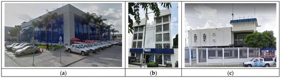 Three public buildings with energy-use indexes (EUI) higher than the average annual consumption value per square meter determined in the study by Vallejo et al. [17] were selected for this study: the Matriz Garzota Integrated Center of CNEL (E1), the 25 de Julio Integrated Center of CNEL (E2) and the Las Orquídeas agency of CNT (E3); see Figure 1a–c. All of them are located in the city of Guayaquil, Ecuador, which belongs to the coastal region. It has a very hot humid climate according to the local climatic zoning with more than 5000 Cooling Degree Days (CDDs 10 °C), and a classification 1A according to ASHRAE 90.1 [18], and belongs to the Aw group (tropical savannah climate), according to the Köppen–Gaige climate classification. During the year, the climate is characterized by two well-defined seasons, humid from January to April and dry the rest of the year. The average monthly temperature variations vary between 23.4 °C and 26.5 °C, and the maximum monthly value reached is greater than 30 °C. It is a humid area because the average monthly relative humidity oscillates between 63% and 76% [19].