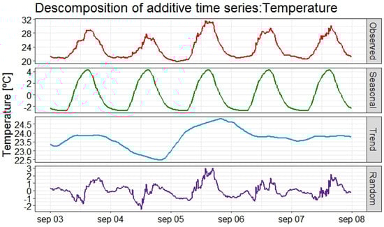 The decomposition of the data series allows a general understanding of global energy demand dynamics of the building [25]. Figure 2 shows the decomposition performed on the ambient temperature and electricity consumption data set of the three buildings. For better visualization in the figures, the results of one working week, from 3–8 September 2018, are presented. The four basic components of a classical time-series decomposition are shown: observed, seasonal, trend and irregular. The observed data can be obtained by summing the values of the trend, seasonal and irregular components.