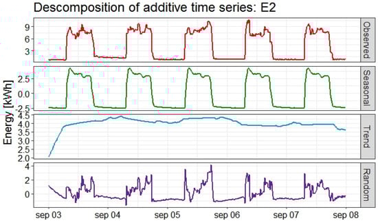 Figure 5 shows the time-series decomposition for E3. Building E3 presents a general consumption of 19 kWh. Graphically, at the beginning and end of the weekend, there is a decrease in consumption, 18.25 and 18.75 kWh, respectively. However, the variability is 2%, so it is considered as an almost constant consumption. The irregular component shows events that cannot be explained by daily periodicity and reaches values of up to 2 kWh. This means that, during working hours, the random consumption events are low with respect to the general load of the building. Prolonged time lapses with values close to 0 kWh are also observed. The seasonal component is repeated during the five working days with a variability of 2 kWh. In addition, it is important to note that the overall consumption of the building is never less than 17 kWh, as shown in the observed data.