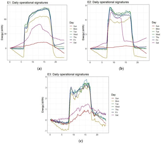 Daily energy consumption profiles in E1 (a), E2 (b) and E3 (c) for days of the week. All data from the analyzed period have been used.