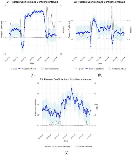 Taking into account that more than 90% of the data analyzed present a normal distribution, Pearson’s linear correlation coefficient analysis was performed between energy and the corresponding temperature, with the respective confidence intervals and p-values, from Monday to Friday. For each Pearson coefficient, a 95% confidence level was used. This means that p-values less than 0.05 represent a significant correlation between the variables. This result was obtained in order to observe the periods in which electricity consumption is influenced or not by the ambient temperature. Figure 7 shows the Pearson correlation between ambient temperature and power consumption for E1 (a), E2 (b) and E3 (c).