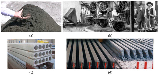 (a) Zero slump concrete; (b) concrete block production in the early 1900s; (c) prestressed hollow core slabs in the 1950s; and (d) production of T-joust in the 1930s.