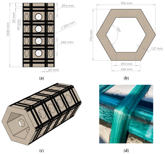 Geometry of the SEAHIVE® unit with reinforcement details (a) side, (b) cross-section, (c) 3D views, and (d) GFRP wrapped used for elements.