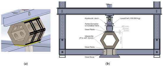 The experimental configuration for the compressive test is illustrated in Figure 5a,b, for specimens measuring 910 mm in length. To ensure an even distribution of the applied load from the hydraulic jack across the surface of the element, two masonite sheets measuring 914 × 457 × 5 mm were placed on the element’s surfaces. Following this, two steel plates measuring 900 × 400 × 25 mm were positioned, one on top and one on bottom of the specimens. Subsequently, load cells were situated over the sample, and the load was applied using a hydraulic jack.