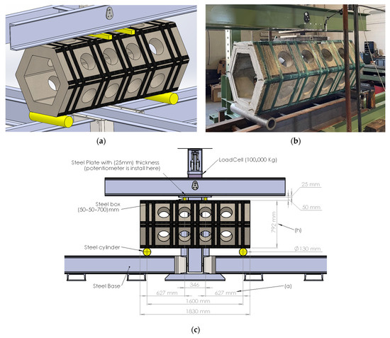 The total span length used for the flexural test was 1.83 m, as depicted in Figure 3a, a dimension aligned with production specifications. As for the compression test, specimens were cut in to two parts by saw-cutting, resulting in two elements, each with a length of 0.91 m. The diameter of the holes on the hexagon was 203 mm, spaced at a center-to-center distance of 346 mm, as illustrated in Figure 3a. Each leg of the GFRP-RC hexagon measured 440 mm in length and 127 mm in thickness. The overall depth of the cross-section was 792 mm, as depicted in Figure 3b. The SEAHIVE® elements were transversally pretensioned with resin-impregnated fiberglass, as illustrated in Figure 3c. The width of prestressing wraps and the distance between them equals 50 mm and 40 mm, respectively (See Figure 3a).