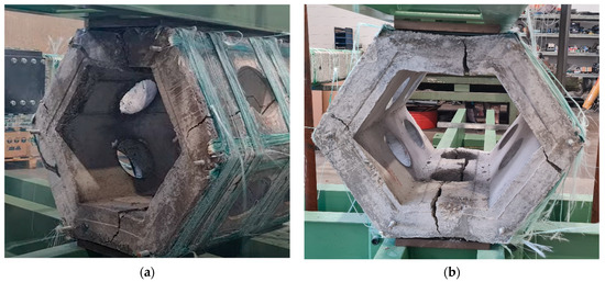 Figure 9a,b show the failed specimens tested under bending. The cracks started to propagate in the middle of the SEAHIVE® at the holes and extended directly upwards. This crack pattern suggests failure due to the bending moment in the area where the moment of inertia is minimal due to the presence of holes. When the longitudinal GFRP strips placed on the bottom (first) and mid-height (second) corners could no longer withstand the tensile stress, they failed and caused the collapse of the specimen.
