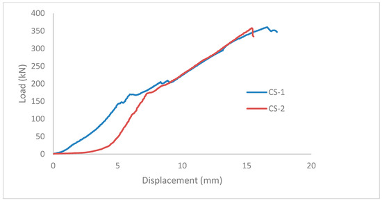 Figure 8 shows the load–displacement diagram of CS-1 and CS-2 tested under pure compression. The horizontal axis indicates the average displacement, and the vertical axis shows the applied load. The first crack occurrence is shown in the diagram by a load drop in both CS-1 and CS-2 around 145 and 172 kN, respectively. After that, the specimens continued to carry the load until GFRP failure (about 358 kN for both).