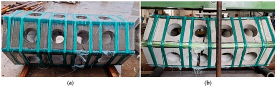 Two full-size units were tested under four-point bending to investigate the flexural behavior of the specimens. As shown in Figure 6a–c, the distance between a support and a loading point (i.e., shear arm = a) is 627 mm, while the total height of the sample (i.e., h) is approximately 792 mm. The a/h ratio is about 0.8 (See Figure 6c), indicating that the unit being tested can be characterized as a deep beam. Two steel plates (25 × 25 × 700 mm) were used as the loading knives positioned over the center of the middle holes.
