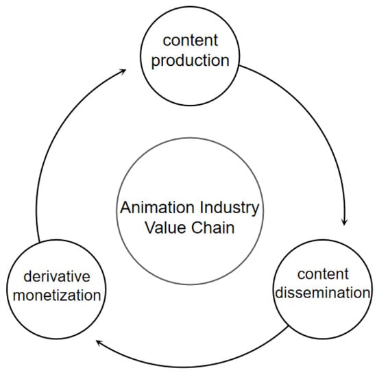 Despite the rapid expansion, a robust development model for the animation industry in China has not yet been established. The value chain can be divided into three segments: content production, content dissemination, and derivative monetization, forming a complete cyclical operating system (Figure 2) [56] in which each segment is indispensable. The degree of completeness of the industry chain directly impacts the level of development. As early as 2011, China became the world’s largest animation producer. The annual production volume reached 260,000 min, twice those of the United States and Japan [57]. However, being a major producer does not equate to being a global leader in animation. Under policy support, the animation industry in China has historically placed more emphasis on quantity than quality. After 2012, however, production volume began to decline while output value increased, signaling a positive shift from quantity to quality. Despite this shift, several unresolved issues remain. For example, many works primarily target children, and domestic audiences continue to demand and heavily rely on foreign animated content [58]. In addition, local productions lack innovation, the overall value chain is incomplete, the derivative market is underdeveloped [59], intellectual property (IP) protection is insufficient, and sustainable development pathways remain elusive.