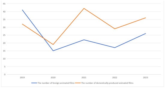 In terms of the market, China is currently the world’s largest producer and trader of animation and the second-largest animation consumer market globally. For instance, between 2015 and 2019, the box office revenue of Chinese animated films grew from RMB 1.9 billion to RMB 7.0 billion, and the share of domestic animated films rose from 5.4% in 2016 to 16.9% in 2019 [75]. Although the development of cinema chains was hindered during the COVID-19 pandemic, it recovered in the post-pandemic era. The year 2023 marked the most significant recovery in the film market in the past 3 years. In total, 62 new animated films were released, a year-on-year increase of 34.78%, and their cumulative box office capacity reached RMB 7.998 billion, accounting for 14.56% of the total box office [76]. The top three highest-grossing films were all produced domestically, with two exceeding RMB 1 billion in box office revenue.