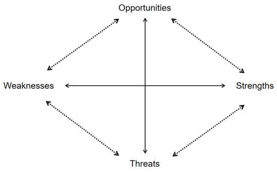 The SWOT analysis, as a dominant framework in strategic management [65] (Figure 5), effectively identifies strengths, weaknesses, opportunities, and threats through a comprehensive and systematic examination of the industry environment [66,67]. It enables the development of corresponding strategies, plans, or countermeasures and helps industries explore market opportunities, identify internal obstacles, and respond effectively to competitive pressures [68], thereby formulating sustainable strategies and plans to achieve continued development.