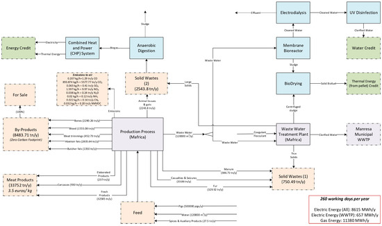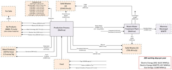 The meat industry examined in this paper is located in Spain, as illustrated in Figure 1. The baseline of the meat industry, which is in operation for 260 days per year, consists of the production process and the WWTP. The production process includes all the required processes for the meat industry, such as scalding, skinning, and airing. Nevertheless, it has been chosen to be demonstrated as one process since there will be no changes in this part of the industry. The input flows of the meat processing phase are pigs, fresh water, and spices, while the outputs are meat products (fresh and elaborated products), meat by-products (blood, animal tissues and guts, meat trimmings, casualties and seizures, abattoir fats, fur, bones, butcher fats), which are currently being sold. Regarding the scale of the meat industry, indicative annual mass flow values include the processing of 500,000 pigs, the consumption of 120,000 m3 of fresh water, and the production of 32,585 tons of fresh meat products. Moreover, the analysis also considers the solid wastes (sludge and manure) produced and the emissions into the air (CO, CO2, SOX, NOX, N2O, NH3, CH4, NMVOC). Energy requirements are mostly in the form of electricity (7,958,000 kWh per year), part of it deriving from natural gas (11,380,000 kWh per year). The industry generates a substantial amount of wastewater, totaling 120,000 m3 per year, which is treated in the WWTP. The WWTP includes certain equipment, such as coarse-scale grid, thin-scale grid, regulator tank, sludge decanter tank, centrifuge, dissolved air flotation, and activated sludge reactor with nitrification–denitrification. The treated water, after the aforementioned processes, is sent to the public sewer to be subsequently treated in an external urban WWTP for further cleaning. Energy (657,000 kWh per year), coagulants, and flocculants are needed for the clarification of wastewater, while solid wastes (300 tons of large and 100 tons of thin solids and 166 tons of centrifuged sludge per year) are also produced. The solid wastes produced during the production process and the WWTP are sent to an external manager for further processing.