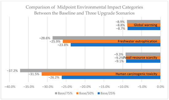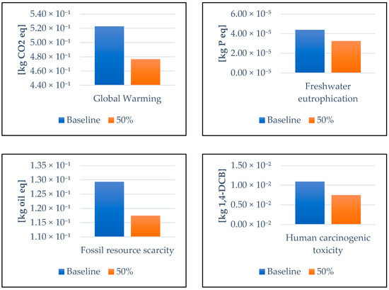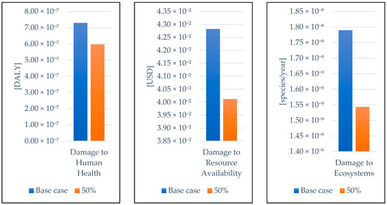 In Figure 4, the comparison of the endpoint environmental impacts is depicted between the base and the ‘50%’ scenario.