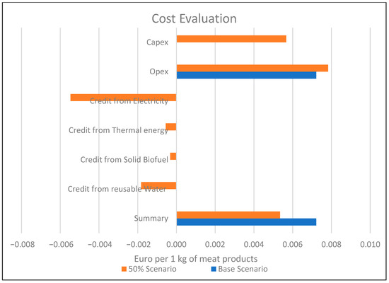 In this section, the results of the LCSA for each of its elements will be presented. The study evaluates the efficiency of directing wastewater from the meat industry to new treatment technologies. For the analysis, it was assumed that half of the wastewater produced is treated in the upgraded system, while the rest is in the conventional treatment plant. Overall, the new system provided numerous benefits to the meat industry, including improvements in its environmental and social footprint and economic evaluation.
