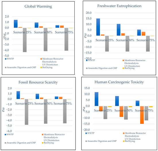 The analysis results highlight several critical findings. Notably, the AD combined with the CHP system—proved highly effective, reducing the impact on Global Warming by 4.2%, FE by 13.8%, HCT by 11.3%, and FRS by 4.6%. The significant reduction in HCT is particularly notable 10.5%, largely due to water savings. The BD process also contributes positively by reducing all environmental impacts, though to a slightly lesser extent than the AD system. Despite this, BD plays a valuable role in the overall reduction in environmental burdens. Conversely, the MBR and EL processes slightly increase environmental impacts due to their energy consumption. More specifically, the impact of these processes on Global Warming is increased by 0.14% and 0.15% though MBR and EL, respectively, but they are essential for sludge–water separation and water clarification. Further analysis of these results can be found in Section 3.2.1.