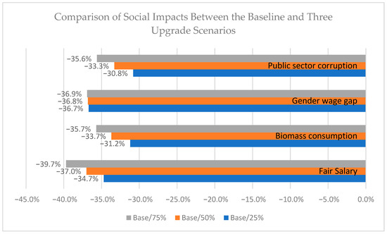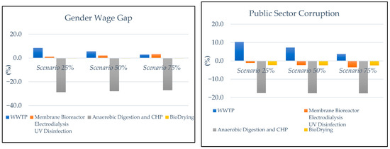 The social analysis comparing the baseline with the ‘50%’ scenario focused on the four most critical impacts. These impacts were chosen based on the risk levels indicated by the social indicators, as well as their relevance to the objectives of both the meat industry and this study. Therefore, the main impacts analysed are the fair salary (FS), Biomass consumption (BC), public sector corruption (PSC), and gender wage gap (GWG). FS refers to compensation that is equitable and appropriately aligned with the value of a specific service or category of services provided. Setting a minimum fair wage should reflect the reasonable worth of the service rendered [44]. The BC indicator measures the rate of BC per process and is a critical resource affecting local communities [44]. PSC, measured by the Corruption Perceptions Index, refers to the misuse of public power for private gain, as perceived by experts and informed surveys [44,54]. The GWG indicator assesses wage disparities between men and women, following the definition of OECD (2015) [44,55].