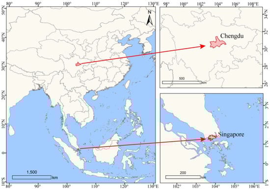Figure 1 shows the geographical locations of Chengdu and Singapore. This map provides a clear visualization of the distinct geographical contexts in which the two cities operate, further enhancing the understanding of their respective agricultural development models and resource conditions.
