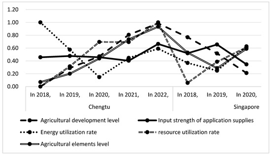 35]. Singapore performs better in terms of energy utilization, but it fluctuates in terms of the level of agricultural development and the intensity of applied inputs.