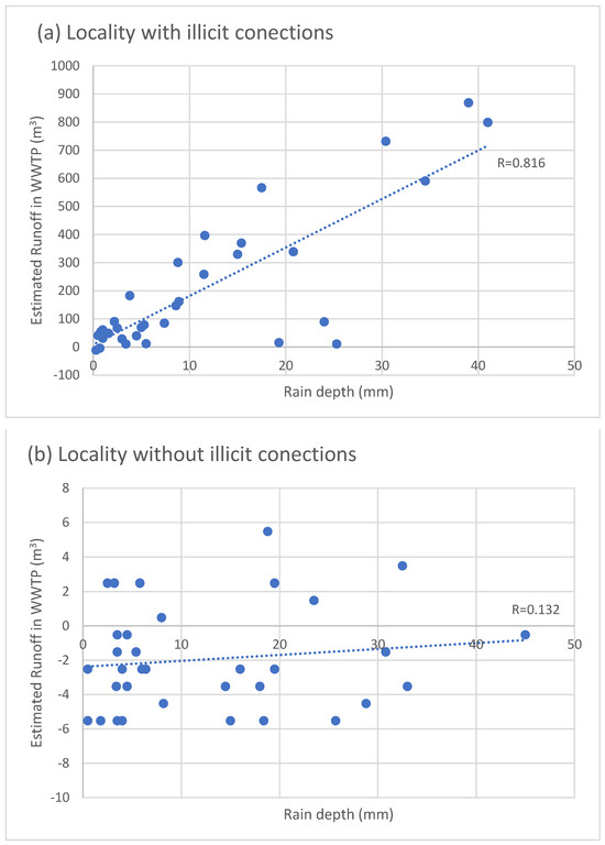 To illustrate the impact of drainage system connections on the sewage system, Figure 1 presents the correlation between rainfall and the estimated runoff at a wastewater treatment plant (WWTP) for two neighboring localities: (a) a locality with known illicit connections and (b) a locality without illicit connections. Rainfall data were sourced from the nearest meteorological station, while runoff estimates were calculated by comparing the actual inflow to the WWTP on rainy days with the average inflow on dry days (i.e., days without rain). Specifically, the estimated runoff was determined as the difference between the daily inflow and the average dry day inflow. The strong correlation in Figure 1a (R = 0.816) versus the weak correlation in Figure 1b (R = 0.132) serves as an indicator of cross-connections between the drainage and sewage systems.