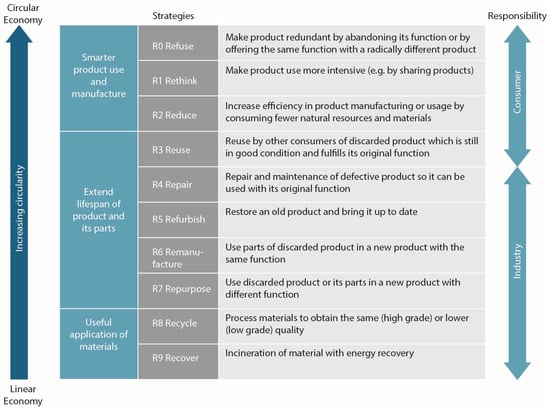 Currently, the circular economy (CE) is receiving more and more attention from scholars and industries. Geissdoerfer looked at peer-reviewed articles on this topic and indicated a significant increase in the past decade [6]. Furthermore, Dzhengiz et al. argued that the circular economy is in danger of being perceived as a vague concept with poorly defined boundaries and unclear definitions, with rapidly increasing research in recent years [7]. Kirchherr summarized 114 CE definitions to create transparency regarding the currently understood CE concept through screening related articles [8]. The researchers pointed out that there have been different recognitions in CE core principles when classifying CE strategies. To express the key CE idea (Figure 1), the nine Rs (reduce, rethink, reduce, reuse, refurbish, remanufacture, repurpose, recycle, and recover) represent the degree of circularity to these products. Braungart and McDonough noted that most recycling is downcycling; it reduces material quality over time. The authors also pointed to rethinking the production/distribution and consumption process before recycling by reorganizing the waste hierarchy [9].