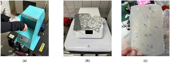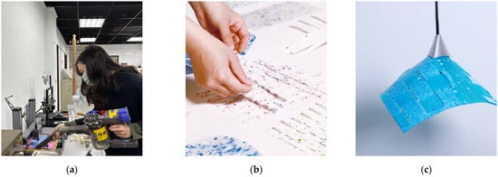 The PPU database exhibits a series of open-source machines that process harvested plastics from waste. Working within a participatory framework, the students actively researched how these machines could transform polymer waste through extrusion, injection, and compression. However, the complexity of these machines, which required professional mechanical engineering knowledge for assembly, led the research team to seek more accessible alternatives. The students and instructor identified a small-scale industrial plastic shredder and a commercial heat press machine with a 200 °C limit through exploratory learning. These tools allowed the students to process polymer waste into shredded particles and transform them into sheets (Figure 4). The limitations of the equipment, such as the size of the heat press bed (which capped sheet dimensions at 30 cm squares), presented challenges. The thematic observation of this phase revealed students’ creativity in overcoming equipment constraints by modularizing their designs.