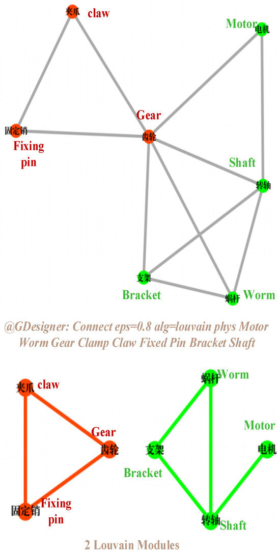 - Output: In order to specify the output form of the task, a hierarchical characterization of the physical architecture needs to be proposed. An ontology model Techspecs Concept Ontology (TCO) [105] for expressing the hierarchical architecture of engineering products has been proposed in the research related to Product Family Design (PFD) based on a Modular Platform. The architecture of TCO is shown in Figure 2a, including the component layer, Modular Layer, and Product Layer. However, the TCO model ignores the interactive correlations between different units under the same layer, so this study proposes the Semantic Graph-based TCO (SG-TCO) model, as shown in Figure 2b. The SG-TCO model uses a graph structure at the component level to characterize the correlations between physical structures, and the modules at the module level are no longer simple collections of discrete physical structures, but communities or clusters in the semantic graph at the component level.