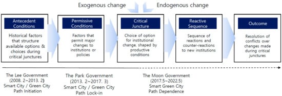 To examine the process and causes of change occurring at critical junctures in Korea’s Smart Green City project, this study adopts Sorenson’s critical juncture framework, which is used for the causal analysis of rapid institutional changes. In Sorensen’s critical juncture framework, historical events unfold according to historical sequence. Sorensen proposed the critical juncture framework for examining the change process of urban planning, advancing its value for the causal analysis of theoretical explanations and institutional change processes [28]. In the critical juncture framework, a critical juncture is the point at which an option is selected from two or more possibilities and a diverging or developmental path begins. In particular, a critical juncture is important because once one of the various alternatives is selected, it is difficult to return to the starting point. Sorensen explained that a critical juncture can be defined as a period of significant change that occurs in a distinct way in a country or subunit of analysis, creating a distinct legacy. He argued that critical junctures are caused by a crisis that undermines the legitimacy of existing institutions, making it possible to reorganize them and create new ones [28].